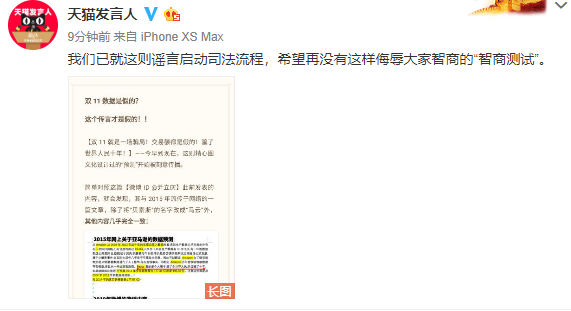 ●针对“网友质疑天猫双11数据制假”一事,天猫讲话人微博12日晚发文称,已就这则启动司法流程。