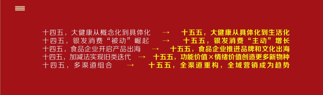 从“十四五”到“十五五”,大健康将由从概念化到具体化改变为从具体化到糊口化;激发消费由“被动”兴起改变为“自动”增加;食物企业由产物出海到推进品牌和文化出海;产物由加减法实现旧类迭代到功能价值×情感价值创制更多新;渠道由多渠道组合到全渠道沉构,全域营销。