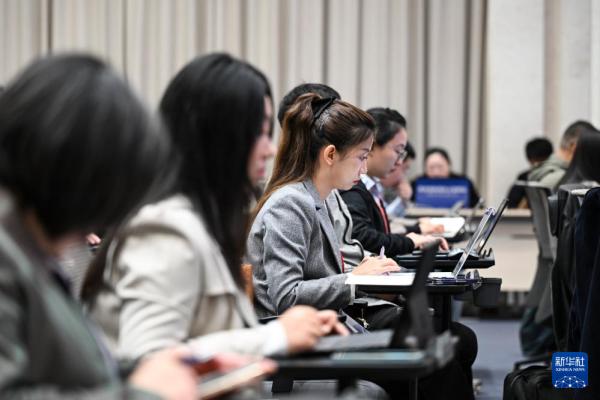 10月14日,国度成长委党组、国度粮食和物资储蓄局局长刘焕鑫,国度粮食和物资储蓄局副局长钱毅、副局长秦玉云引见“十四五”期间粮食畅通成长成效,并答记者问。这是记者正在现场工做。记者 陈晔华 摄