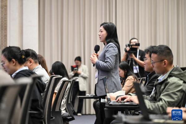 10月14日,国务院旧事办公室正在举行“高质量完成‘十四五’规划”系列从题旧事发布会,国度成长委党组、国度粮食和物资储蓄局局长刘焕鑫,国度粮食和物资储蓄局副局长钱毅、副局长秦玉云引见“十四五”期间粮食畅通成长成效,并答记者问。这是记者正在现场提问。记者 陈晔华 摄