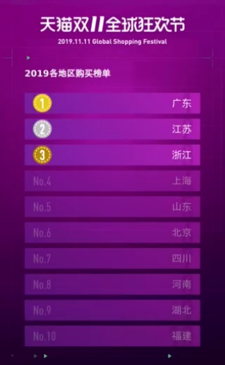 此外,本年天猫“双十一”总成交额2684亿,此中广东、江苏、浙江排名前三,上海、山东、、四川、河南 、湖北、福建排名四到十名。